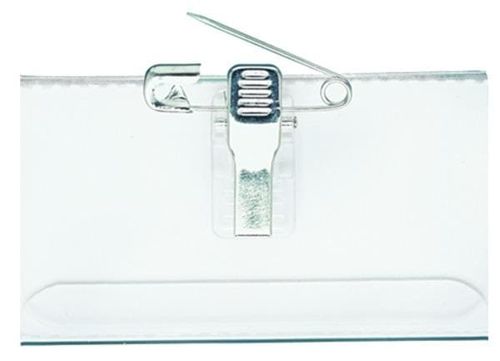Выполнен из плотного прозрачного пластика, на задней стороне металлический зажим и дополнительное крепление, булавка.