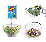 Дисплеи серии UNIBOWL - стильное и оригинальное торговое оборудование для обособленной выкладки небольших и мелких товаров. Блестящий прозрачный пластик, из которого выполнена чаша, эффектно презентует товар, стимулируя его продажи. Все дисплеи серии UNIBOWL отличает легкость монтажа – устанавливается и разбирается без инструментов.
