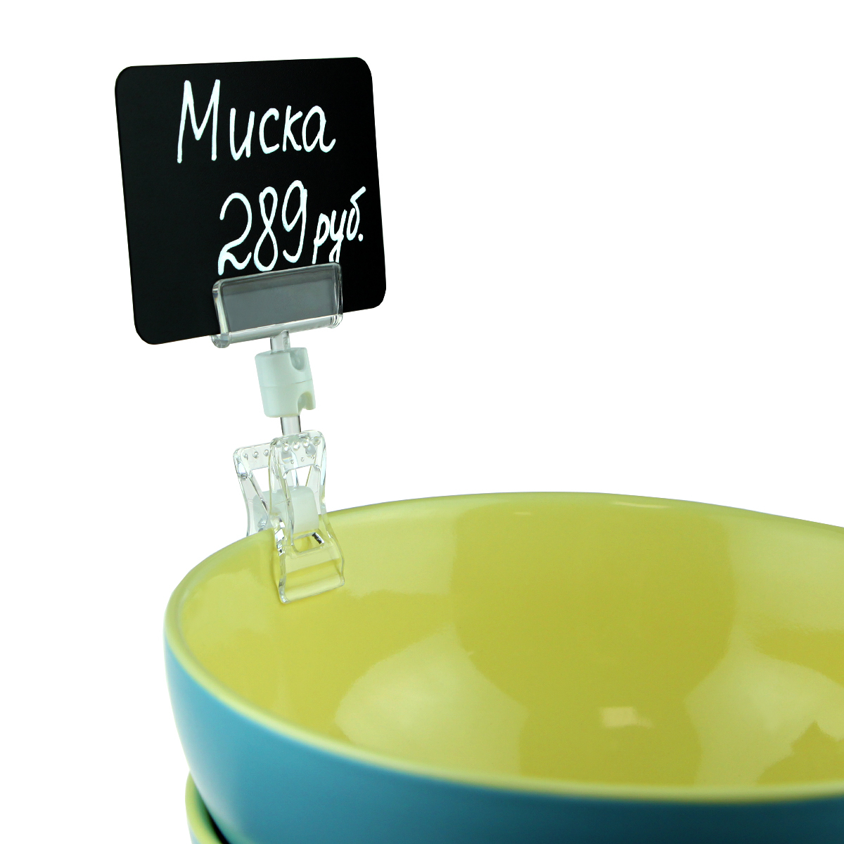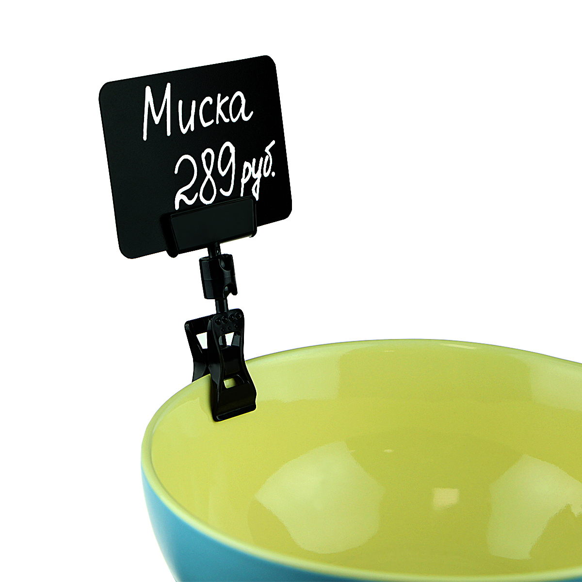Универсальный ценникодержатель прищепка. Надевается на торец полки, край коробки, корзины, блюда толщиной до 10 мм.