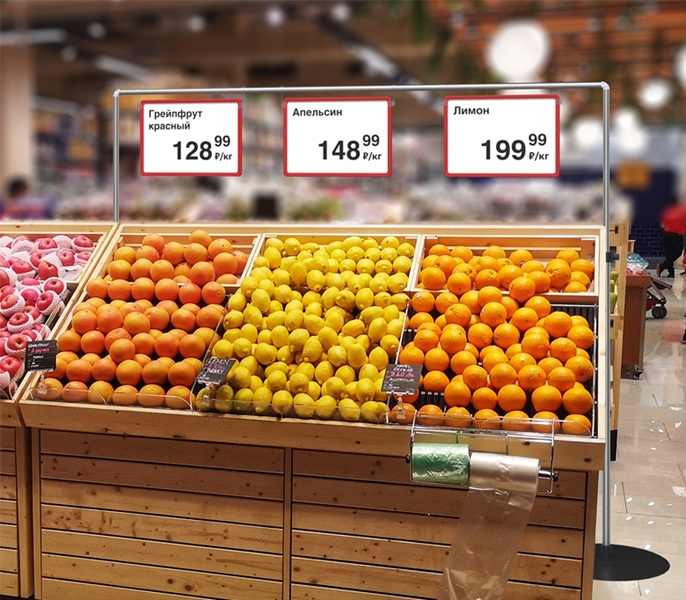 Система проста в монтаже, легко перестраивается и может быть дополнена соединительными элементами для создания напольных конструкций, что особенно удобно в отделах фруктов и овощей